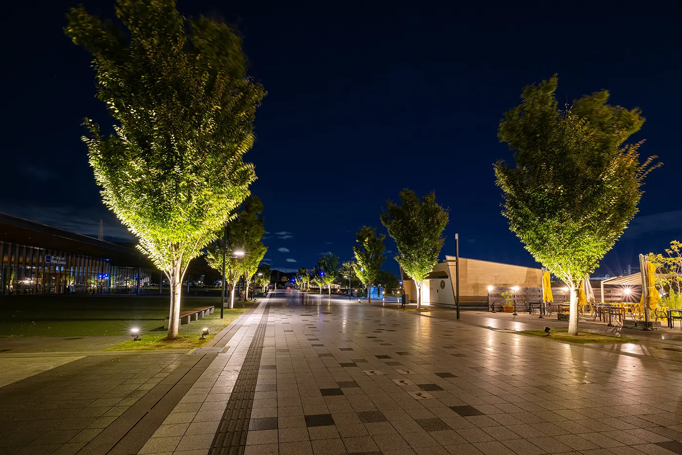 咖啡馆和出租空间周围都亮着暖色调的灯光,建筑的直线条与光影交错,营造出一种令人愉悦的韵律。这里不时可以看到家庭和散步的人们,这种“日常生活之光”的自然融合是这座公园独有的特色。堀先生说:“这里的光线柔和,看着它,我的心就平静下来了。”