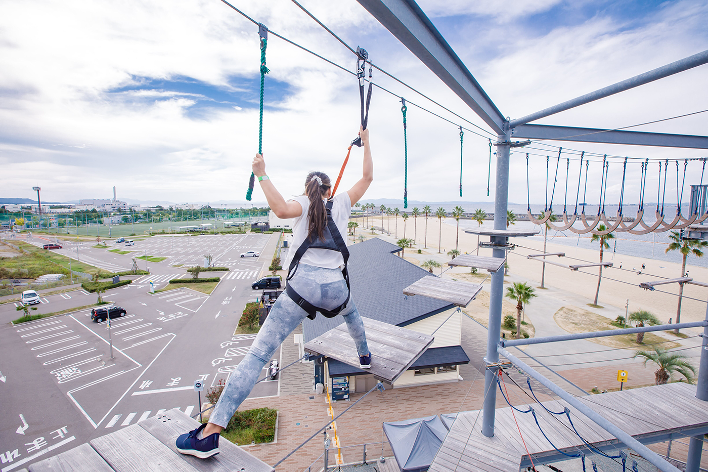 The athletic experience costs 2,500 yen (tax included) for 60 minutes. Participants must be at least 125 cm tall (children under 12 and under 140 cm must be accompanied by an adult) and wear comfortable athletic shoes (gloves with good grip (available for purchase on-site) are also recommended). You can also enjoy the observation deck and the lowest floor, which overlook the beach and Kansai International Airport, for just 500 yen (tax included) for 60 minutes.