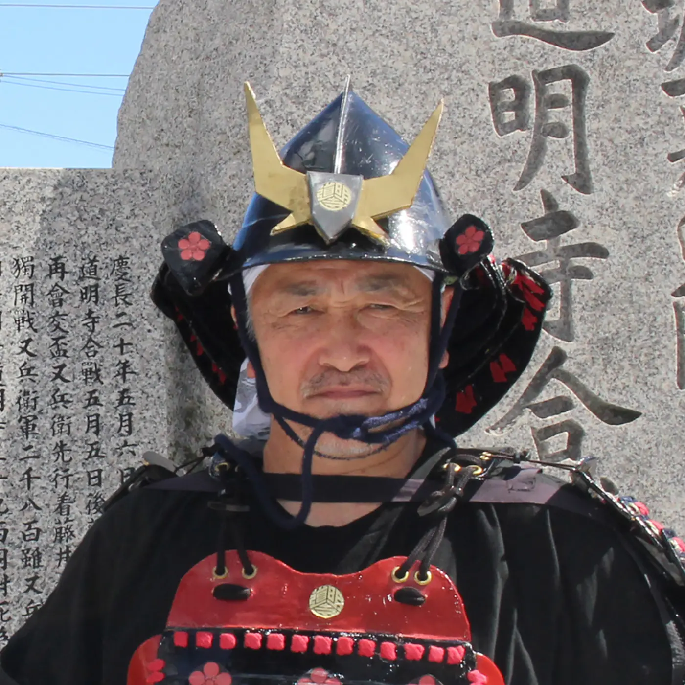 It takes 19 minutes by semi-express train from Osaka Abenobashi Station to Domyoji Station, where the battle took place. As I headed towards the "Osaka Summer Siege Domyoji Battle Memorial Monument" in front of the station, I met Shinoda-san wearing a replica suit of armor.