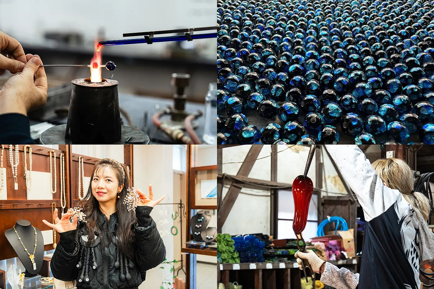 もともと棒ガラスの工場として発展した佐竹ガラスですが、2000年代半ば頃から、蜻蛉玉を始めとした工芸品の製作にも取り組んでいます。