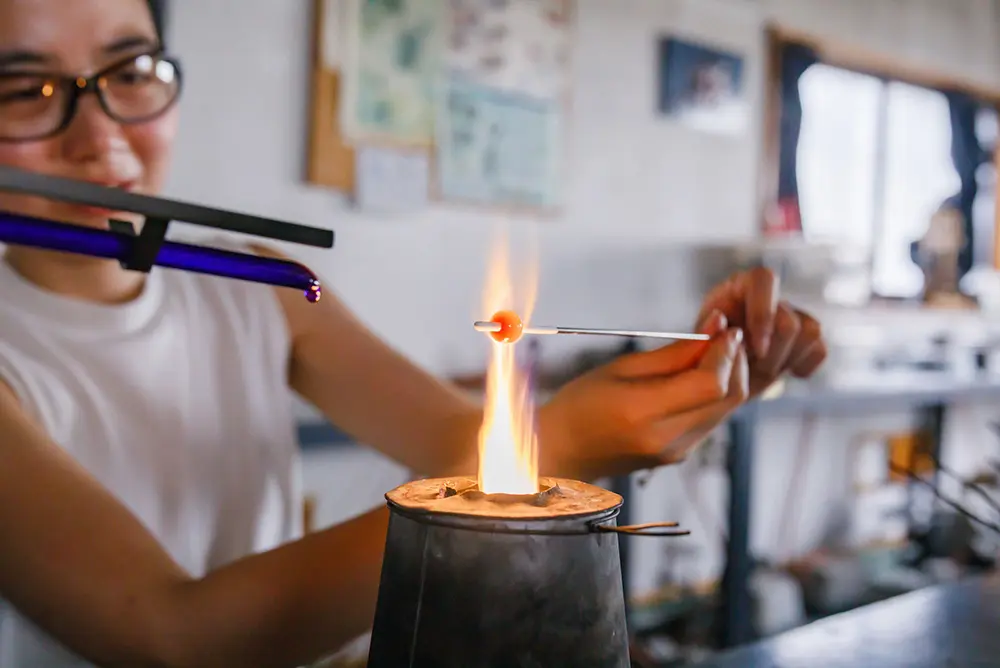 バーナーで熱したガラスを思い通りの形にするには、熟練の技術が必要です。手仕事によって生み出される作品は、ガラス特有の冷たさを感じさせない独特の温かみを持ち、希少価値の高い工芸品として多くの愛好家に支持されているのです。