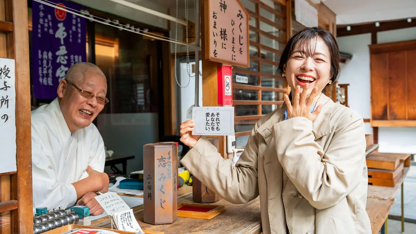 對這位年輕女孩來說,這是一次令人興奮的體驗!她在布乃瀨神社抽籤戀愛神籤